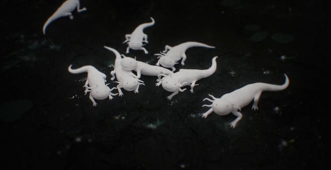 “Zoon” by Jonatan Schwenk is an immersive exploration of the paradoxical nature of life, survival and existence, set against the backdrop of a nocturnal forest. Clocking in at just over four minutes, the film embarks on an engaging narrative journey through the interaction between a group of axolotls and the larger, bipedal forest dwellers who encounter them.